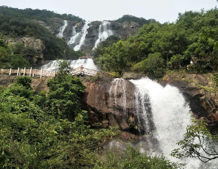 第三站:白水寨风景名胜区。位于广州市增城区北部山区的派潭镇,景区里山高林密,空气清新,充沛的降雨量造就了中国大陆落差最大的瀑布白水仙瀑。从山脚至山顶,修建在白水寨山丘陵线上的是被誉为“天南第一梯”的登山步径。它横跨三座高山,连接两大天池,全长6.6公里,共有9999级石阶。游客沿此路登山,可一站站拜访仙瀑美景。汇高全员在此完成登顶。